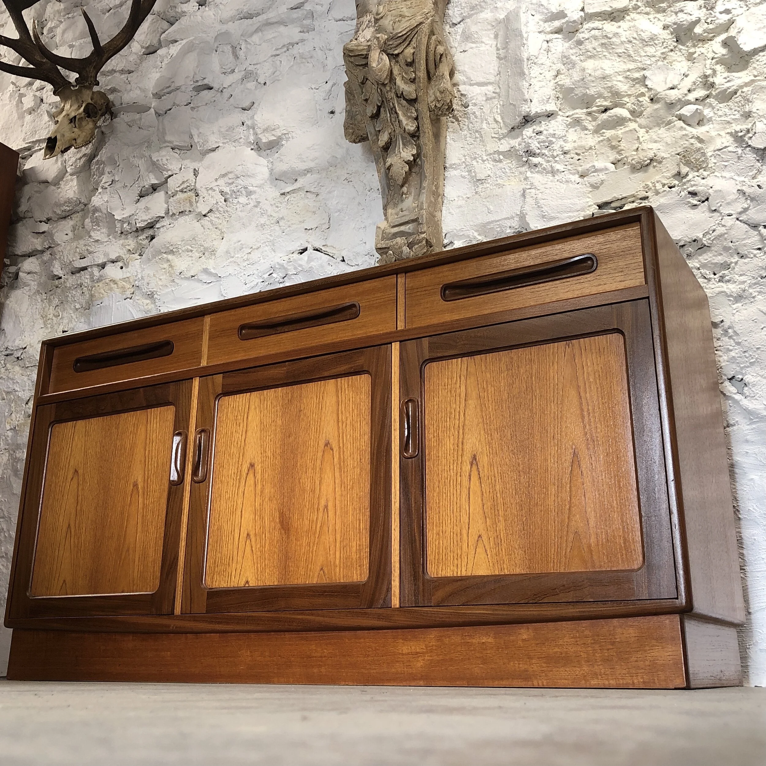 This sideboard/credenza was designed by the British designer Victor Wilkins as part of the Fresco series. The Fresco series is a range of sideboards Wilkins designed for the British furniture producer G-Plan. The series was highly influenced by the Danish designers of the time, like Finn Juhl, Arne Vodder and Ib Kofod Larsen