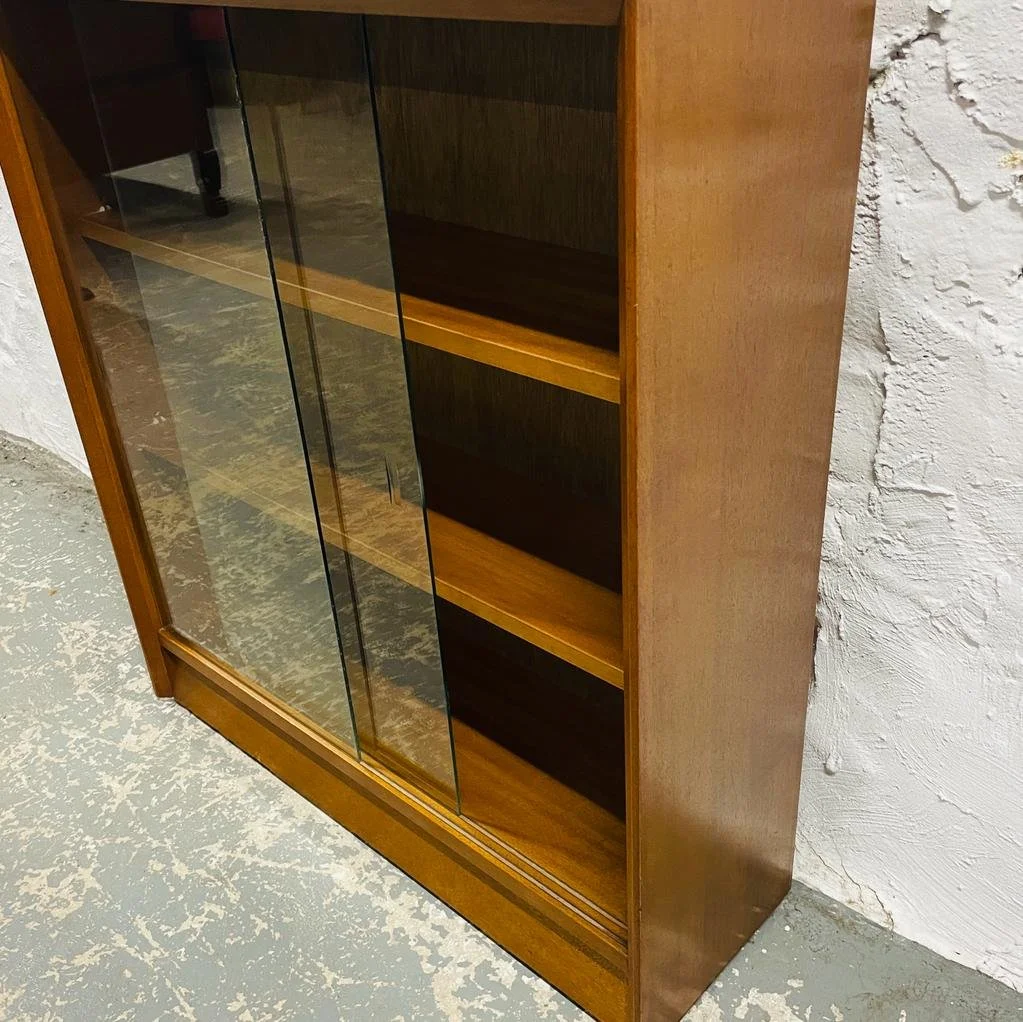 A small vintage bookcase with adjustable height shelves and two sliding glass doors. This bookcase would suit a compact space such as a hallway or office.