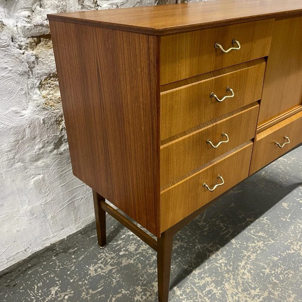 This stylish Nathan Sideboard known as Concord when released in the 1950s, Has 5 drawers, top drawer divided for cutlery. Fronts are gracefully bevelled and enhanced with solid brass handles. Spacious cupboard with fitted shelf and sliding doors. Floor adjusters fitted to the legs.