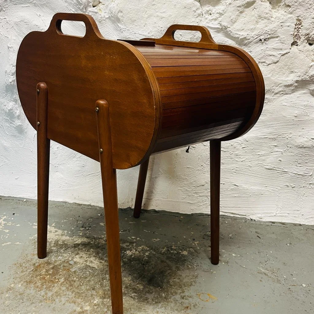 Revolving-Top sewing box from the 1950’s. Teak ply carcass sitting on splayed legs. Tambours slide open to give a little storage. Great secret stash for your cheeky drinks.