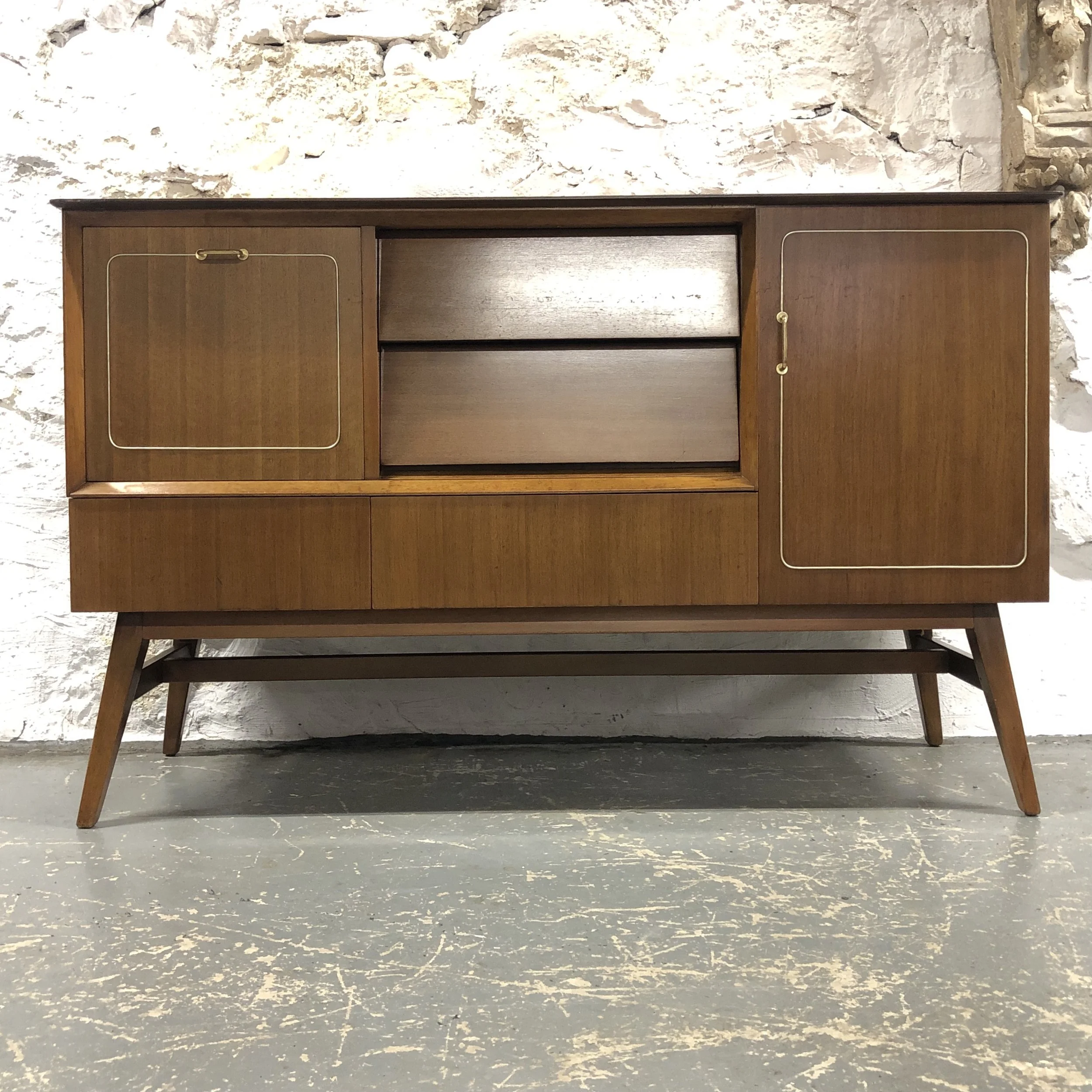 A mid-century teak low cocktail cabinet by Beautility with multiple storage compartments, comprising of 2 middle drawers, 2 lower drawers, drinks cabinet to the left and drinks storage behind the right door.