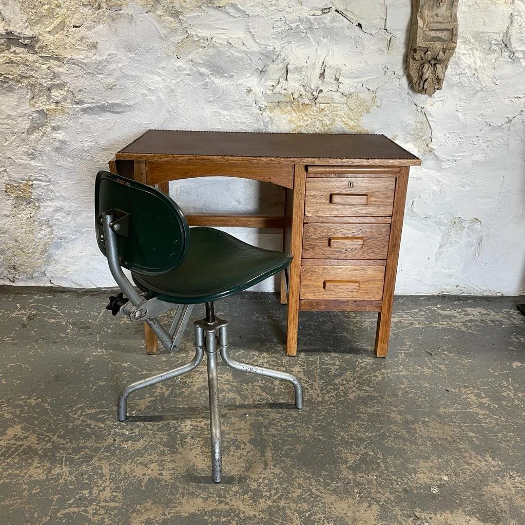 A lovely vintage piece that has been stripped back to the original oak wood, leaving a slight darkening to the grain and giving it an industrial aesthetic. As seen, the desk has a drop leaf panel to the left hand side as well as a pull out slide above the bank of 3 drawers on the right hand side. The surface of the desk has a lush brown vinyl with distressed studs surrounding the perimeter.